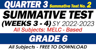 Below are the available ready-made summative tests for GRADE 6 covering WEEKS 3-4 (Summative Tests No. 2) of Quarter 3. These tests are based on the Most Essential Learning Competencies (MELCs) set by the Department of Education. Download these files for free. You may also improve it to better fit your learners.
